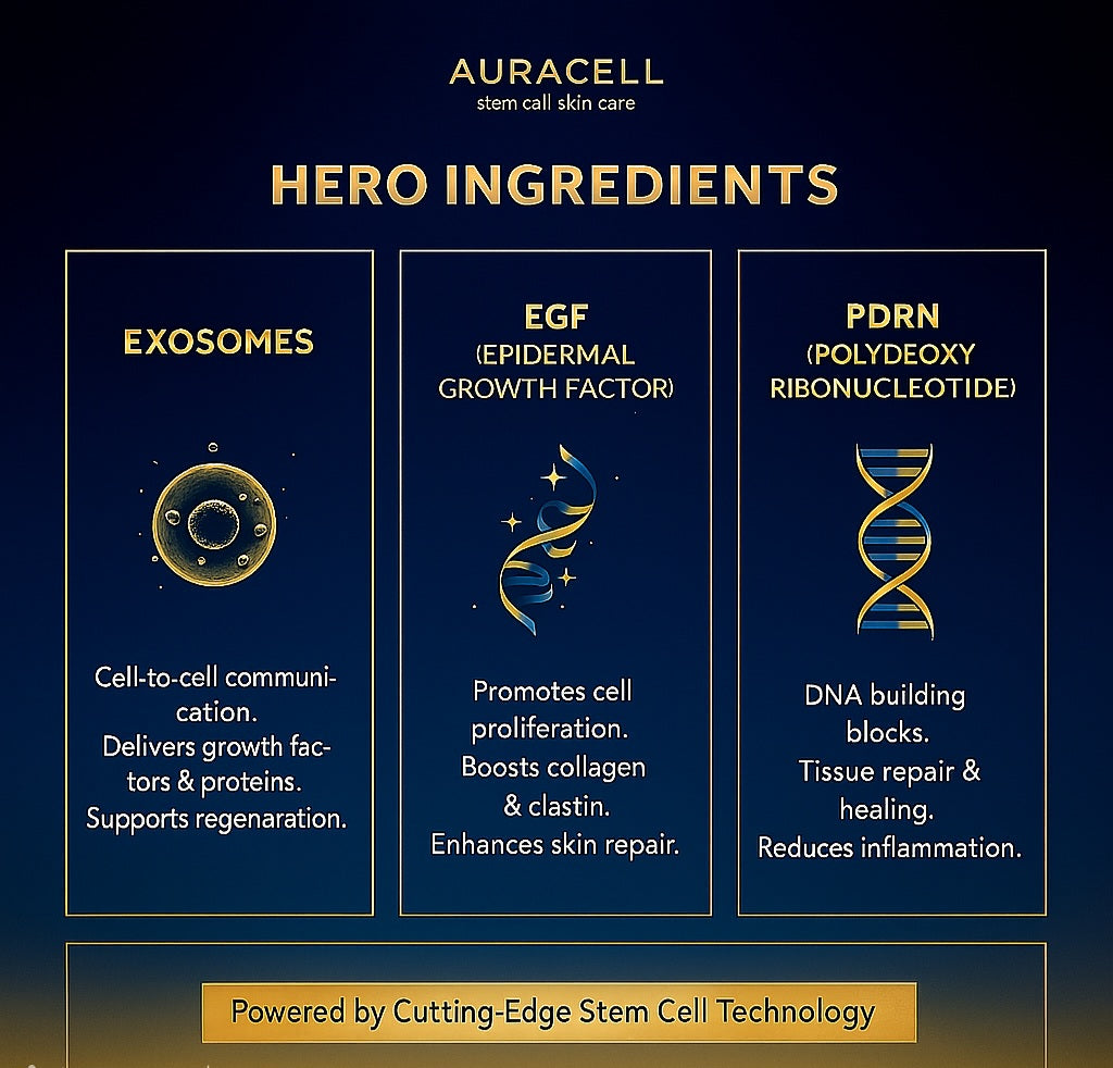 In Skincare Science, stem cell research has led to the discovery of key molecules—MiRNA, growth factors, PdRN, peptides, exosomes, and other cellular components that signal skin cells to repair, renew, and restore a youthful function. Auracell combines all of these in its Stem-Tech Complex™, representing the next evolution in regenerative skincare.